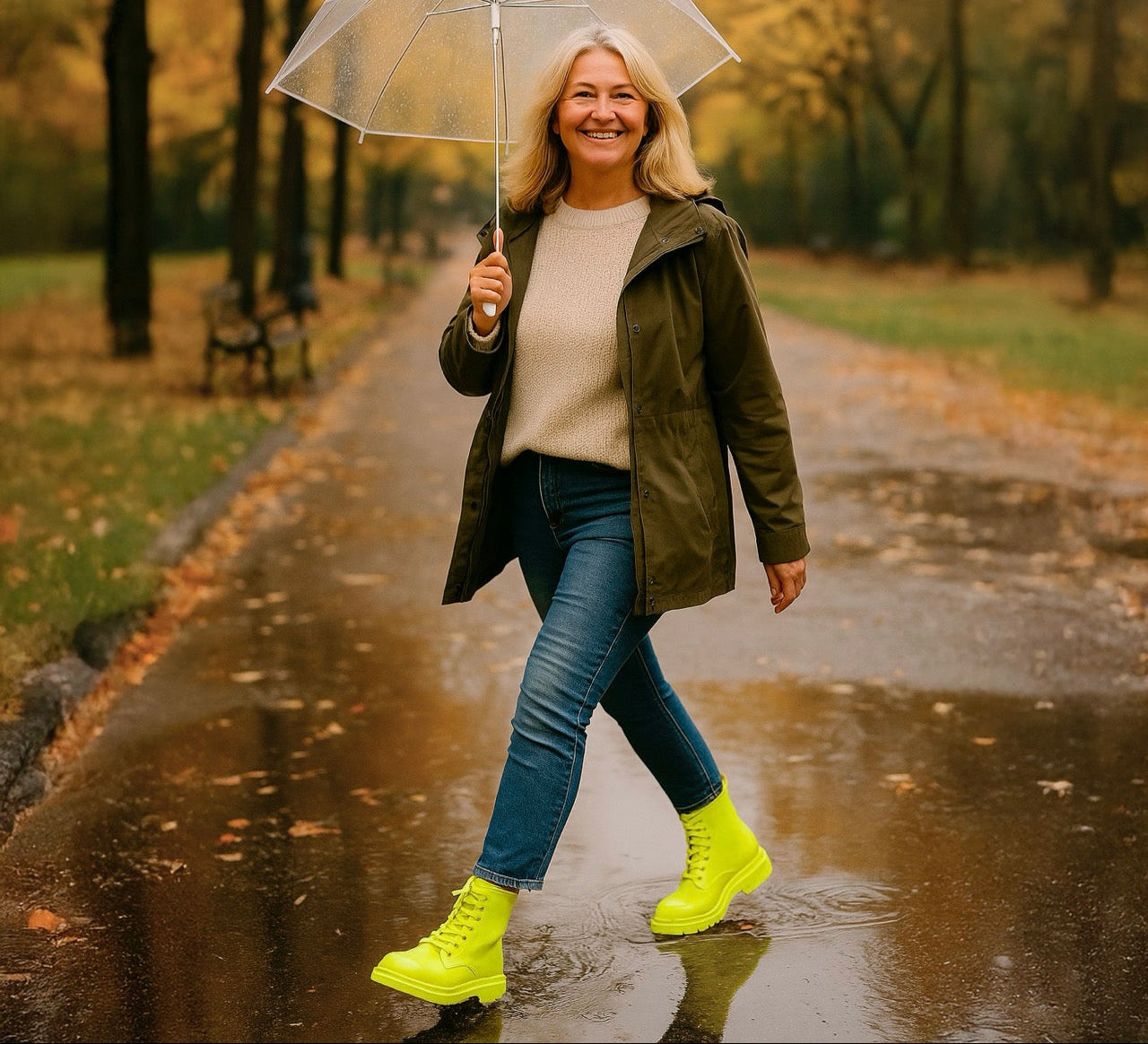 Unser hochwertiges PVC und Design halten Pfützen, Schlamm und lange Strecken aus – zuverlässig, stabil und ohne nasse Füße bei wechselhaftem Wetter.